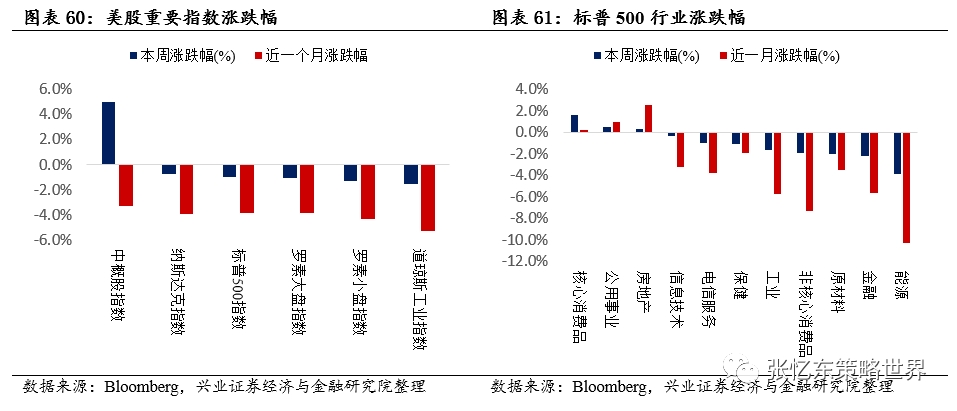 本周以来,除中概股指数,其余美股主要股指均下跌。中概股指数上涨5.01%,其中标普500跌1.03%,纳指跌0.79%,道指跌1.53%,罗素大盘跌1.1%,罗素小盘跌1.28%。行业层面,涨幅前三的为核心消费品(涨1.57%),公用事业(涨0.53%)和房地产(0.28%),房地产近一月涨幅达2.57%;跌幅前三的为能源(跌3.88%)、金融(跌2.6%)和原材料(跌2.02%),受原油价格拖累,能源行业近一月跌幅超10%