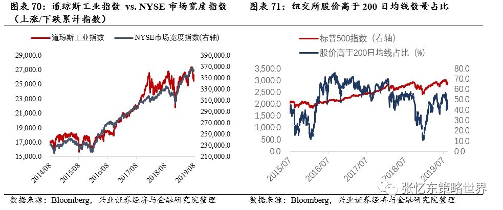 美股市场情绪短期仍不稳定,10年期-2年期国债收益倒挂给市场造成较大的波动。首先,本周美股个股期权看跌看涨成交量比例10日移动平均继续上行,截至周五比例为2.13%。其次,VIX指数于10Y-2Y美债收益倒挂当日高达22.1,8月16日收盘为18.47;第三,本周纽交所市场宽度指数(上涨/下跌股票数量指数)较上周有所下降,下降320个点,股价高于200日均线占比不断下跌,由上周五48%下降为本周五41%。