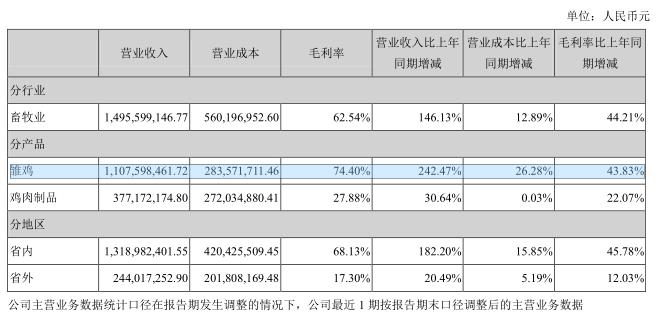 对此公司将其归结为,报告期公司主营产品商品代鸡苗售价大幅上涨,收入增加,毛利上升。