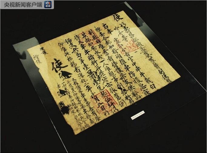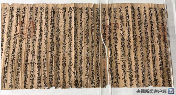 △公元964年(宋代)的酒账单,记载了当地政府的公务用酒,包括数量和用途,如宴请、接待使节、犒赏等。账单共100条,反映了当时敦煌繁荣的文化和多民族的密切交往。(央视记者彭汉明拍摄)