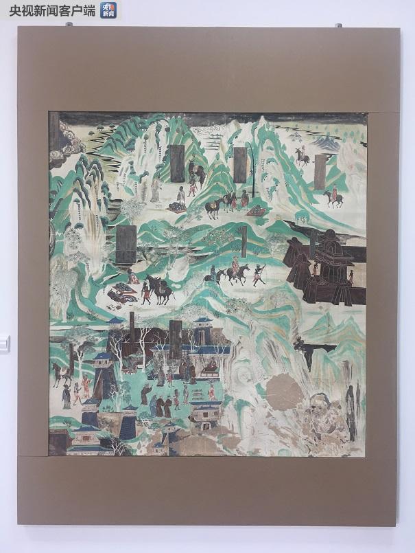 △常书鸿在1955年临摹的青绿山水画。这幅画位于盛唐时期开凿的莫高窟第217窟南壁。(央视记者李辉拍摄)