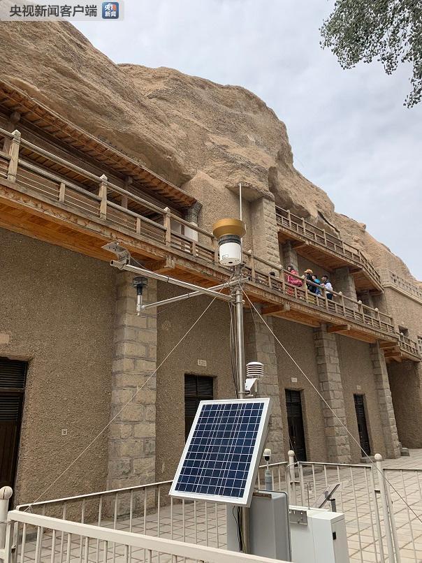 △为保障洞窟壁画和彩塑保存环境稳定,敦煌研究院采用现代物联网技术构建了莫高窟监测预警体系。这是处于莫高窟第72窟前的环境监测设备,可以进行气象、空气质量和颗粒物监测。这些数据会实时显示在敦煌研究院的监测中心大屏。(央视记者郭晗光拍摄)