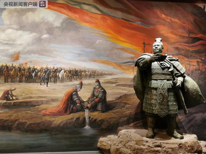 △相传在西汉时,汉武帝派骠骑将军霍去病率军出征匈奴。霍去病大败匈奴后,驻兵在现在城东的泉湖一带。捷报飞传长安,汉武帝大喜,赐御酒一坛。霍去病不愿独享,将酒倒入泉中,将士开怀畅饮,称为“酒泉”。酒泉市博物馆的一幅画描绘了这一场景。