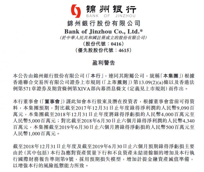 锦州银行称,截至2018年12月31日止年度及截至2019年6月30日止六个月预期录得净亏损主要由于(其中包括)本行为应对资产质量下行和不良资产未结清余额的增加及本行执行国际财务报告准则第9号,采用预期损失模型,增加计提金融资产减值准备,以增强本行的风险抵御能力所致。