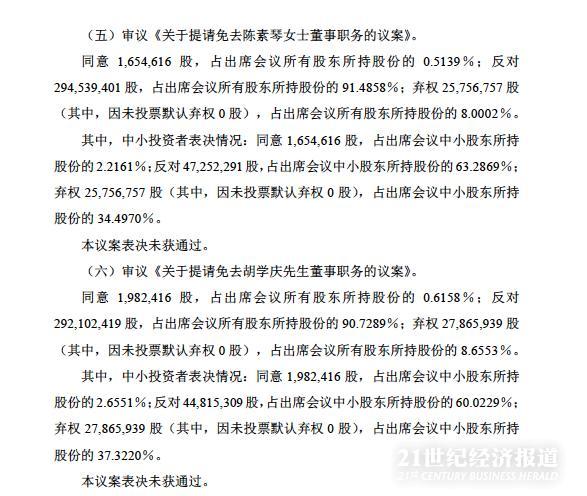 从结果来看,陈海军、阮光寅、王松涛、何永吉4位现任董事被罢免,而2位董事陈素琴、胡学庆得以“幸存”。其中,免去陈素琴、胡学庆董事职务2个议案的否决票数,均达90%以上。
