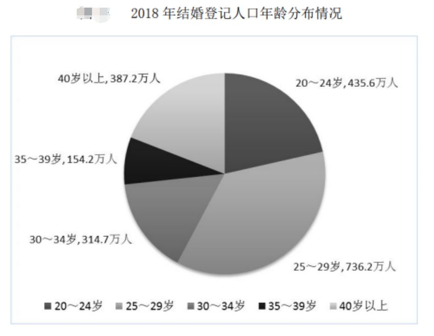 记者还注意到,《公报》展示了各年龄段人口在结婚登记人口中的人数。其中,25~29岁年龄段的登记结婚人口最多,为736.2万人,在2018年总的结婚登记人口中占到36.3%,其次是20~24岁年龄段,占比为21.5%。