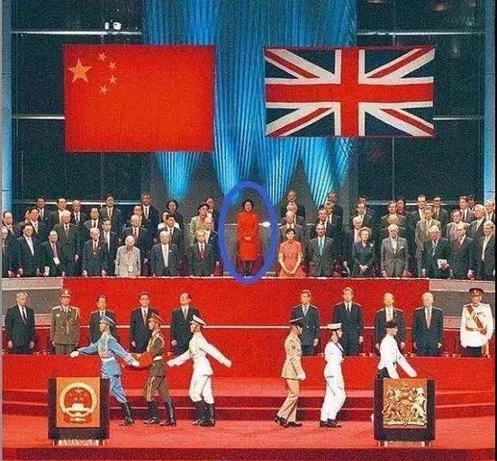 陈方安生一身红衣出席香港回归交接仪式,站在中间C位