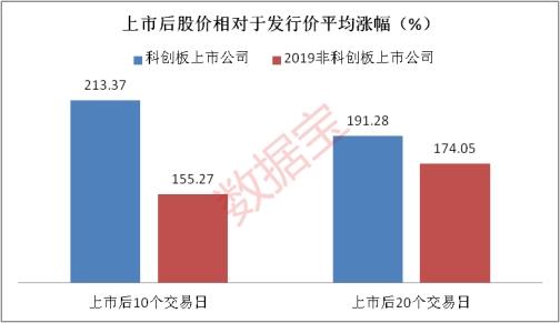 与非科创板上市公司相比,科创板公司在上市后短期内普遍获得了更高的股价涨幅。已上市的28家科创板公司上市后10个交易日股价相对发行价平均涨幅为213%,高出年内其他板块新股的平均涨幅58个百分点;上市后20个交易日平均上涨191%,高出其他板块新股涨幅17个百分点。