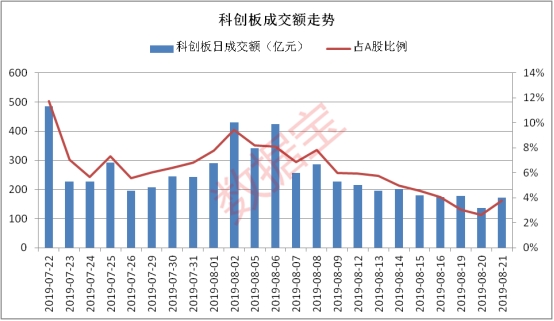 二十余家科创板公司的集体上市曾引发部分投资者关于科创板“抽血效益”的担忧。从近一个月的运行情况来看,科创板上市公司的日成交额走势渐趋平稳,8月以来日成交额在A股中的占比逐渐下滑。今天科创板累计成交172亿元,占A股总成交额比重的3.79%,连续6个交易日成交额占比低于5%。