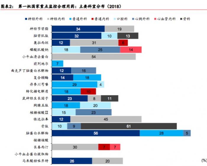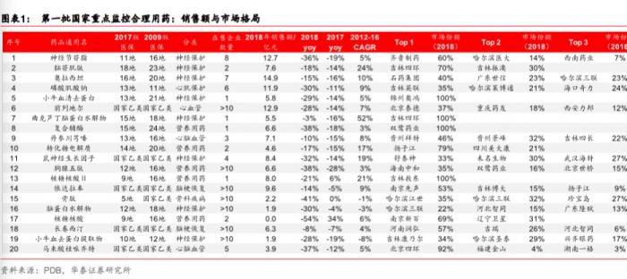 华泰证券对上述监控目录名单整理数据显示,这20个品种主要集中在神经保护、心血管等类别,近两年来的销量都已经逐渐出现了不同程度的下滑。例如,用于脑梗疾病的骨肽2018年的销售额比上一年下滑41%,营养用药核糖核酸销售额下滑54%。而这些产品在2017年之前,市场销售额绝大多数一直稳定增长。