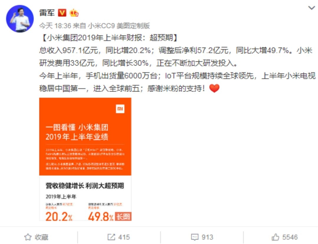 雷军发布微博称,小米上半年财报超预期,“今年上半年,手机出货量6000万台,IoT平台规模持续全球领先,上半年小米电视稳居中国第一,进入全球前五;感谢米粉的支持!”