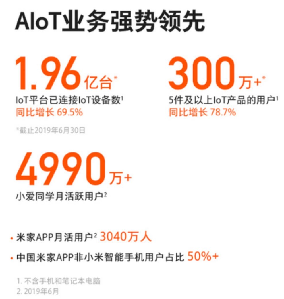 值得注意的是,小米在今年初启动了“手机+AIoT”双引擎战略,使得其用户群不断扩大且接入平台的设备数量持续增长,2019年6月,MIUI月活跃用户达到2.79亿,同比增长34.7%。截至2019年6月底,IoT平台已连接的IoT设备(不包括智能手机及笔记本电脑)数量达到约1.96亿台,同比增长69.5%;此外,人工智能助理“小爱同学”的月活跃用户于2019年6月达到4990万人,同比增长88.3%。