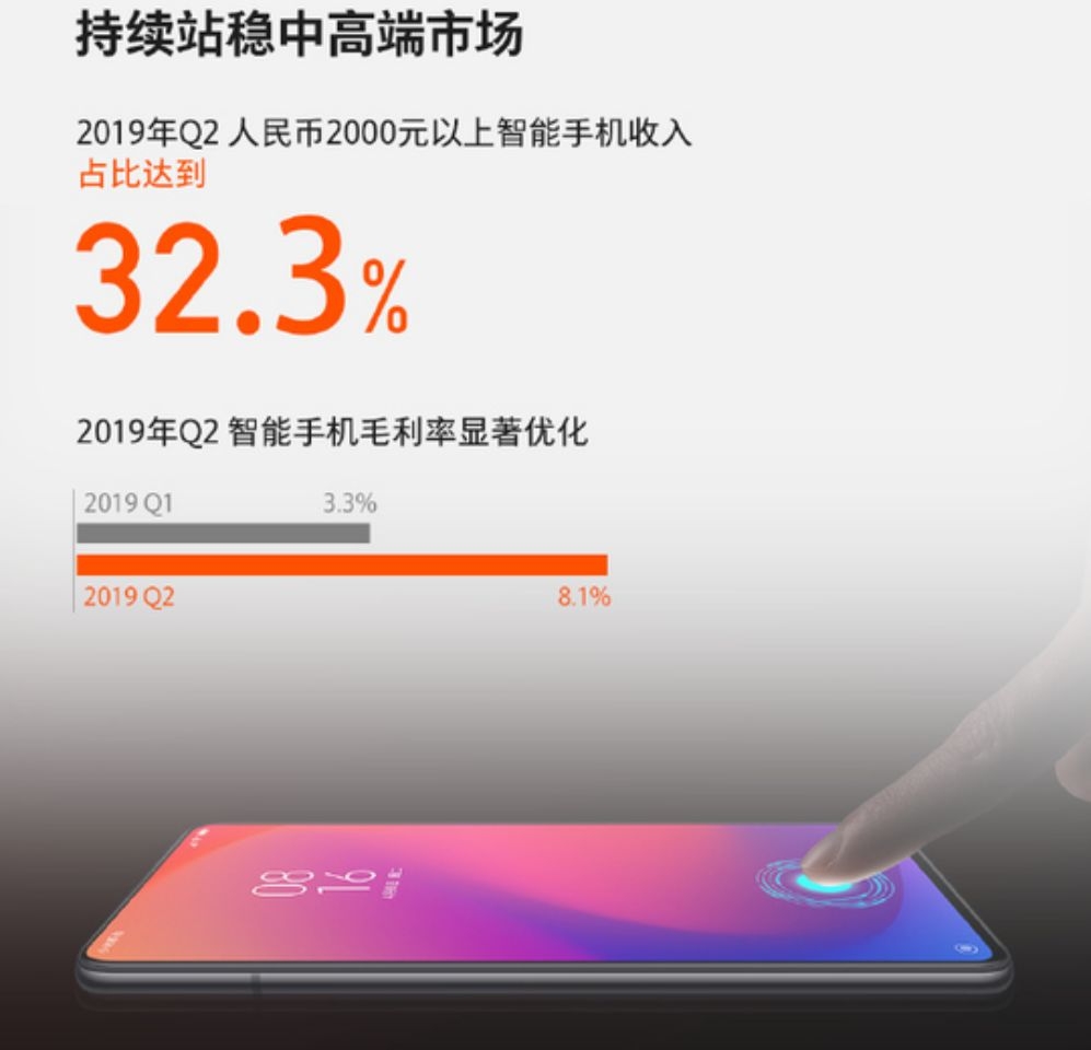 小米智能手机毛利率提升,多品牌策略成效还不错,持续站稳中高端市场。数据显示,2019年二季度人民币2000元以上的智能手机收入占比达到32.3%,毛利率显著优化。小米智能手机的由第一季度的3.3%增长至第二季度的8.1%。
