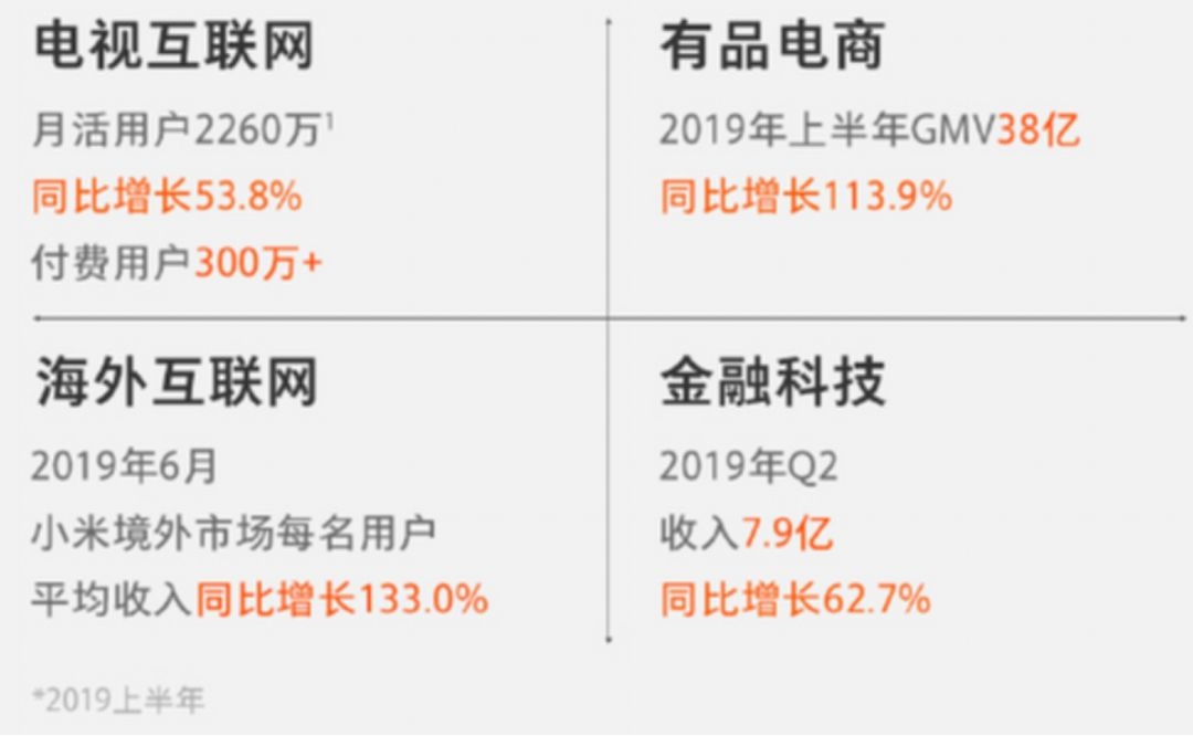值得注意的是,其他互联网增值服务收入达人民币14亿元,同比增长89.9%,主要原因是金融科技业务和有品电商平台收入的迅速增长。今年上半年,有品电商平台的商品交易总额(「GMV」)达到人民币38亿元,同比增长113.9%;今年第二季度,金融科技业务的收入达到7.92亿元,同比增长62.7%,小米现时金融科技业务主要为消费贷款及供应链融资。