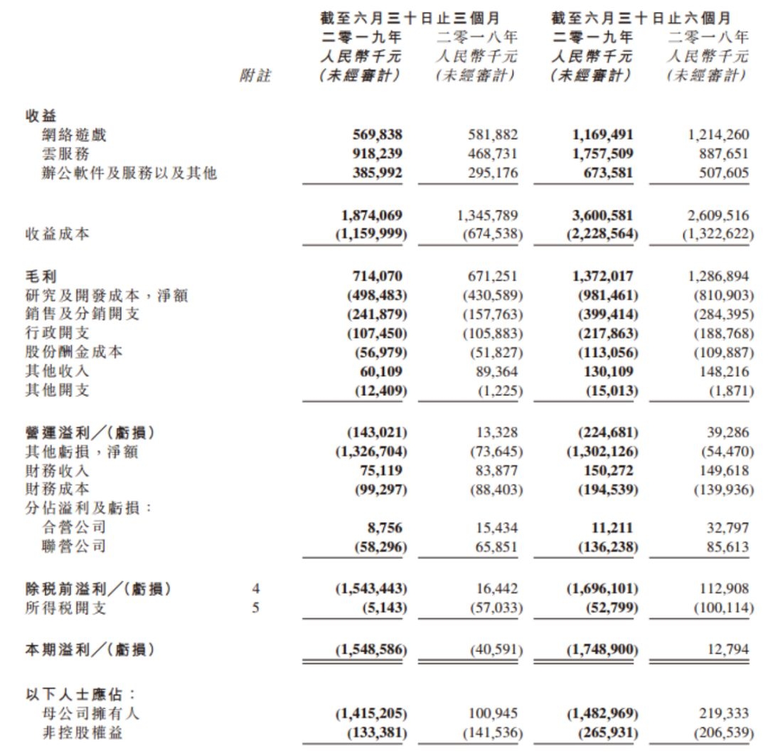 据了解,来自网络游戏、云服务、办公软件及服务以及其他的收益分别占公司2019年上半年收入总额的32%、49%及19%。