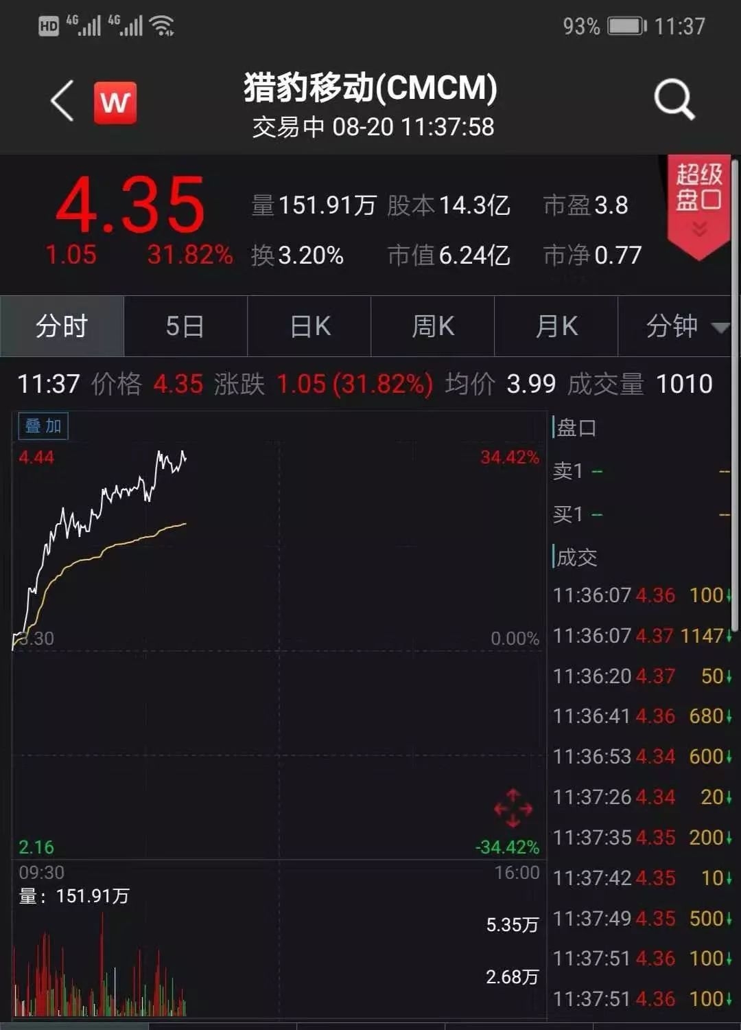 晚间美股开盘,猎豹移动大涨超过20%,最新股价是4.02美元,表现非常抢眼。改为:晚间美股开盘,猎豹移动大涨超过20%,截至记者发稿股价是4.35美元,涨幅扩大到31.82%,表现非常抢眼。
