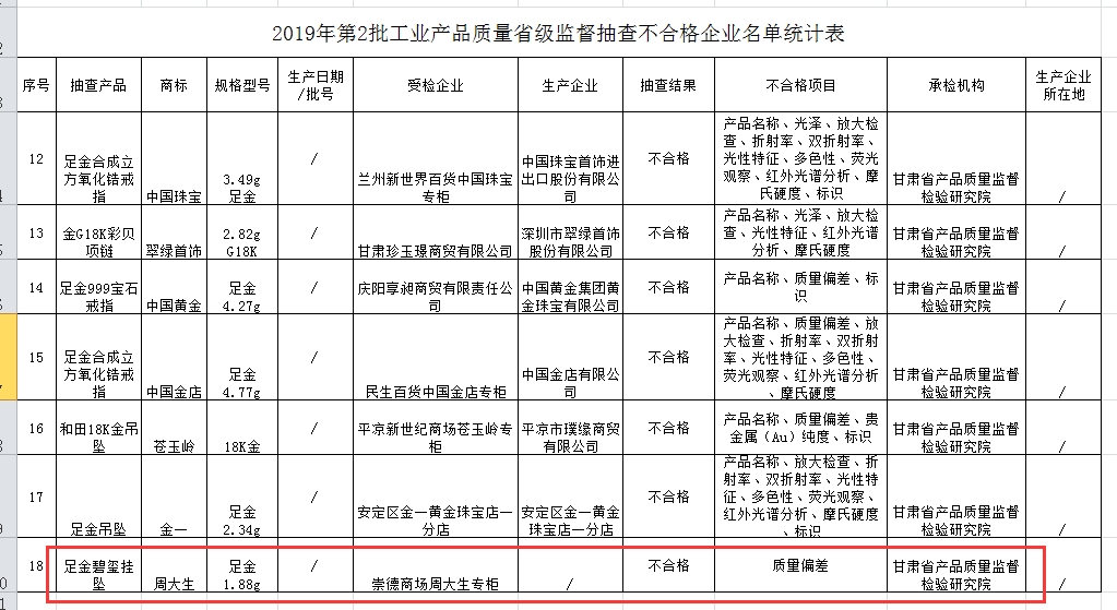 在甘肃省市场监督管理局发布的“关于甘肃省2019年第2批工业产品质量省级监督抽查结果通报”中,被点名的一款规格型号为“足金1.88克”的足金碧玺挂坠,显示受检企业为崇德商场周大生专柜。经过检测,甘肃省产品质量监督检验研究院认为该款产品不合格,原因是“质量偏差”。甘肃省产品质量监督检验研究院研究员林慧介绍,该产品质量比标识质量少了0.08克。