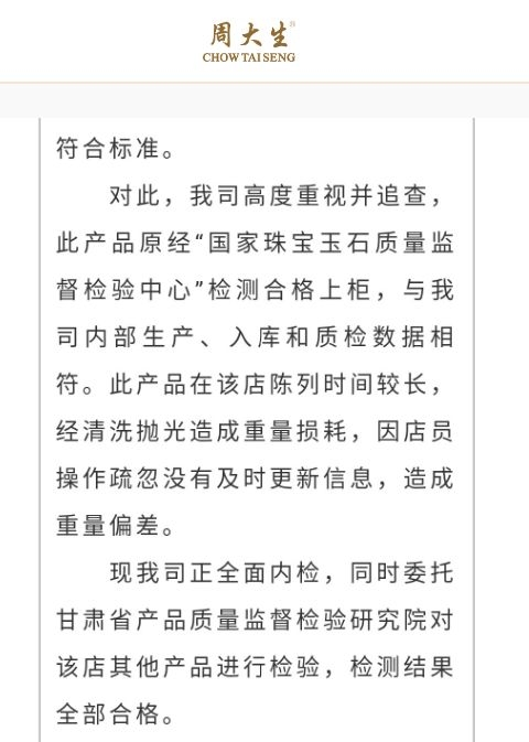 周大生日前在官网发布声明称,不合格产品陈列时间过长,经清洗抛光造成重量损耗,因店员操作疏忽没有及时更新信息,造成了重量偏差。目前公司正全面内检,将认真吸取教训,进一步加强产品检验和市场管理。