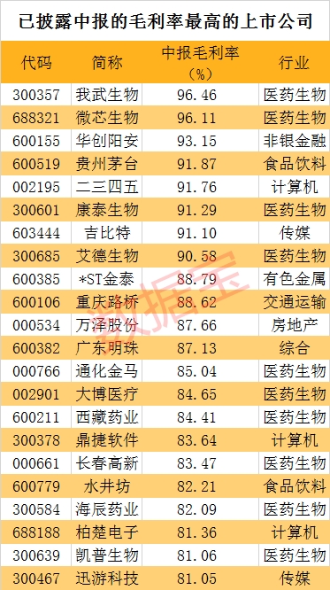 22家上市公司毛利率超80%