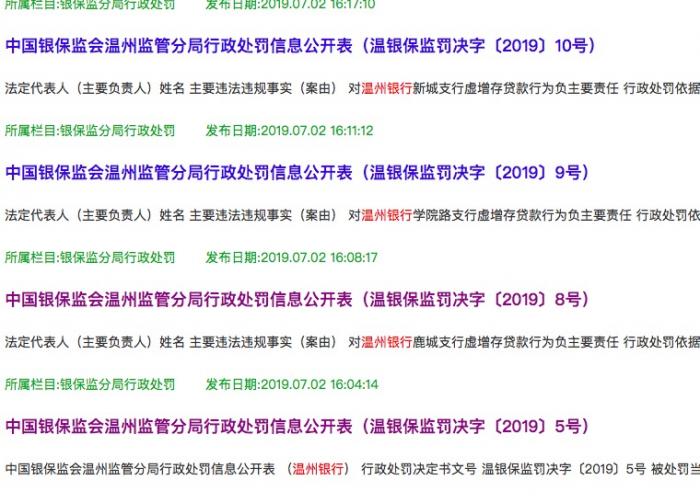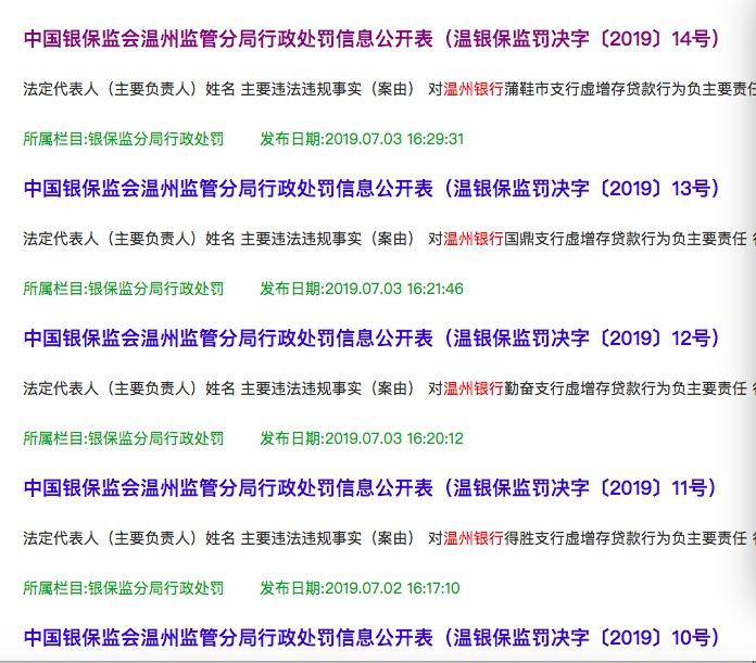 其实,温州银行“内部整顿”事件早就传遍行内行外,早在数月前的7月2号、3号两天,银保监官网就公示了温州银行共8张罚单。