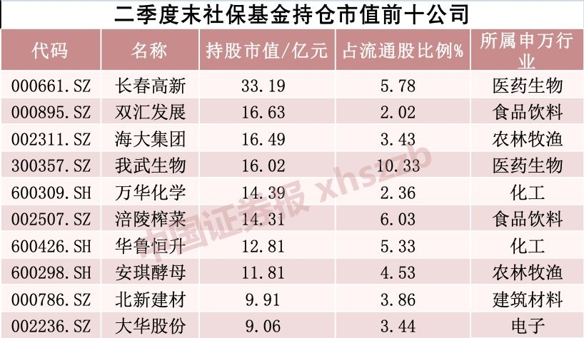 社保持仓市值前十大个股中,持仓市值最大的是长春高新。二季度末社保基金持有长春高新981.91万股,持仓市值达到33.19亿元,占其流通股比例为5.78%。