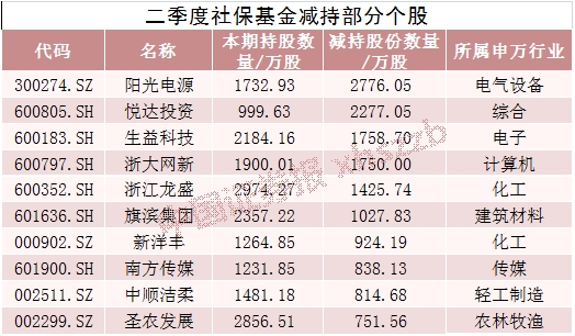 39只个股在二季度遭到社保基金的减持,阳光电源、悦达投资、生益科技、浙大网新、浙江龙盛被减持数量居前,减持数量均超过1400万股。