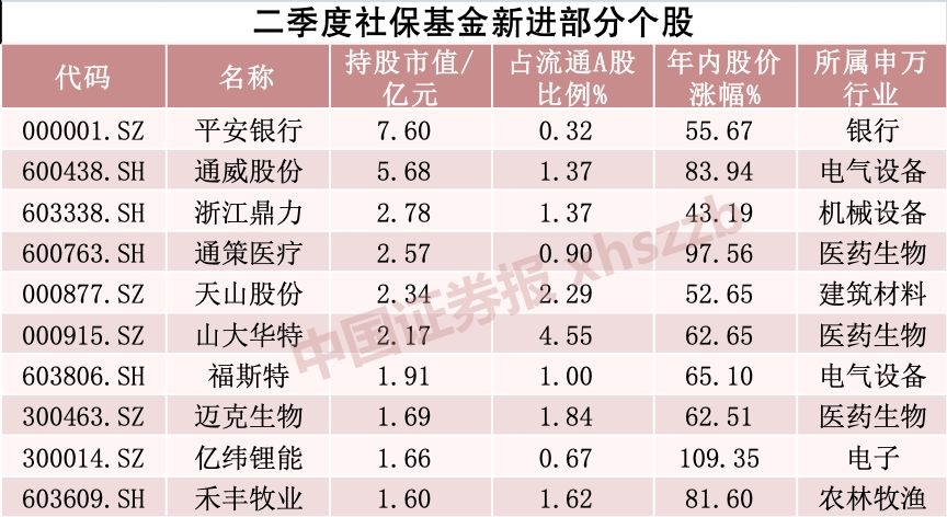 此外,社保基金新进持仓市值较大的公司,还有通威股份、浙江鼎力、通策医疗、天山股份、山大华特等,这些公司今年以来股价涨幅均超40%。