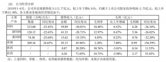 正邦科技坦言,受非洲猪瘟疫情影响,上半年大量生猪养殖企业及中小养殖户减少存栏甚至退出市场,导致猪饲料市场需求疲软,竞争加剧。上半年,正邦科技猪料产品毛利率较上年同期提升0.47个百分点,但受市场低迷影响,猪料产品销量仍同比下降22.63%。此外,猪饲料销售收入同比下滑28.71%,毛利同比下滑26.02%。