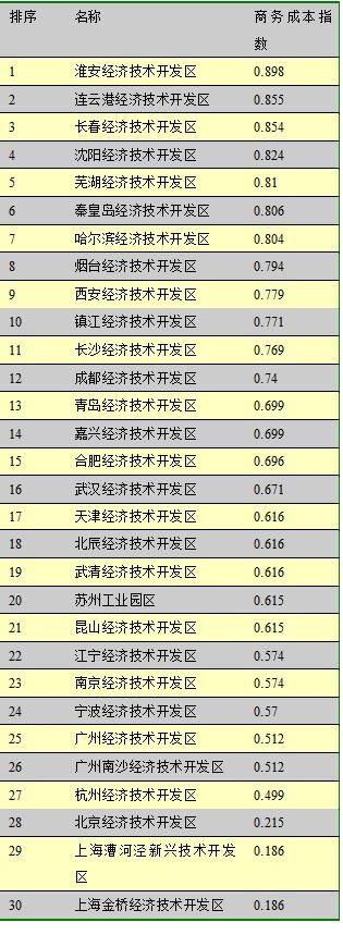从结果看,二三线城市经开区的商务成本比较低,商务成本指数得分最高(商务成本指数是逆指标,成本越高,得分越低)的前10名,分别是淮安、连云港、长春、沈阳、芜湖、秦皇岛、哈尔滨、烟台、西安、镇江的经开区。