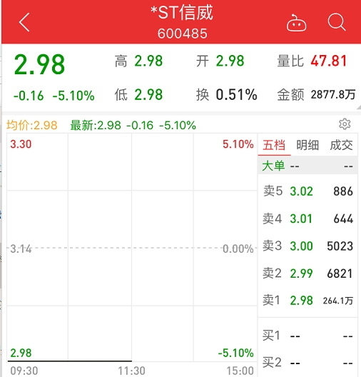 在2016年12月遭遇质疑后,*ST信威连续停牌近3年,投资者苦等930天后,等来的却是股价无尽的跌停。今日开盘继续一字跌停,稍微令人欣慰的是,量能稍有放大,上午下跌5.10%,收盘价为2.98元,成交额达2878万元,换手率达0.51%,较前一个交易日明显放大。