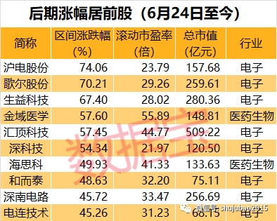 将时间向后推移,6月24日至今,这1005股平均下跌1.75%,但整体跑赢同期沪指(下跌3.48)。具体到个股,沪电股份、歌尔股份、生益科技、金域医学等14股涨幅多,均在40%以上。