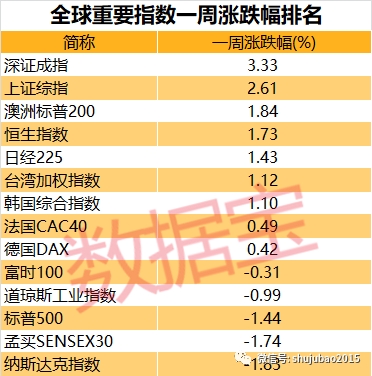 本周美国三大股指均下跌;欧洲三大股指除富时100外均小幅上涨;亚太股市本周普涨。