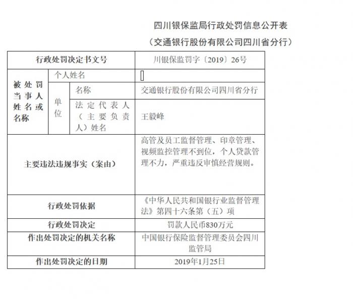 行政处罚决定书显示:交通银行股份有限公司四川省分行因存在“高管及员工监督管理、印章管理、视频监控管理不到位,个人贷款管理不力,严重违反审慎经营规则”等违法违规事实,被处以830万元罚款。