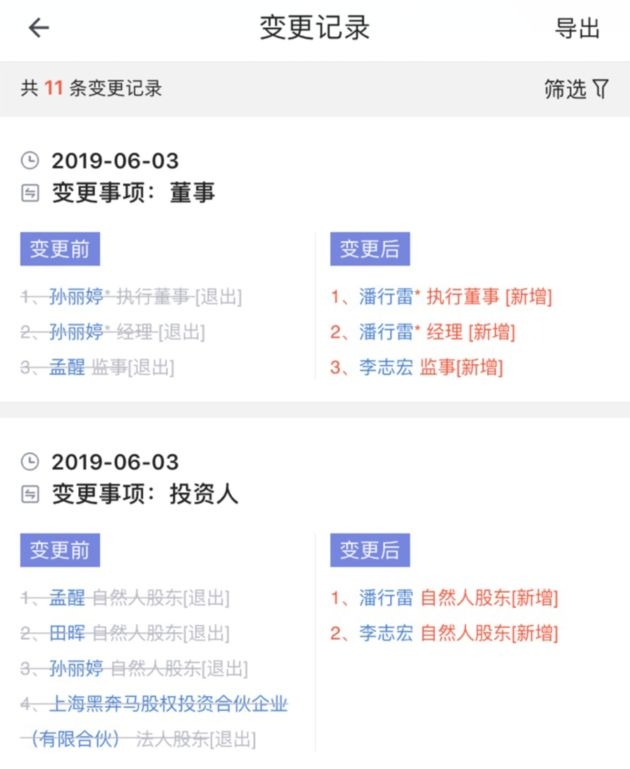每日经济新闻(微信号:nbdnews)记者在启信宝看到,雕爷牛腩背后的运营公司为一宗(北京)餐饮管理有限公司(以下简称一宗餐饮),成立于2012年11月、注册资本20万元。今年6月3日,一宗餐饮的法定代表人孙丽婷,作为自然人股东的孟醒、田晖,以及法人股东上海黑奔马股权投资合伙企业(有限合伙)齐齐退出该公司,取而代之的是新的法定代表人潘行雷和自然人股东李志宏。