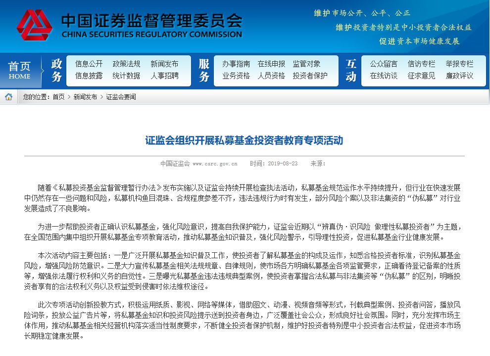 8月23日晚间,证监会官网发文披露,于近日组织开展了私募基金投资者教育专项活动。