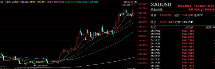 全球贸易摩擦进一步加剧,避险资产进一步升温,已经没有什么可阻挡金价上涨,黄金今日早盘一度突破1550美元/盎司,最高冲至1554.56美元/盎司,今年以来黄金的涨幅已经超过20%,已经成为最“硬核”的避险资产。