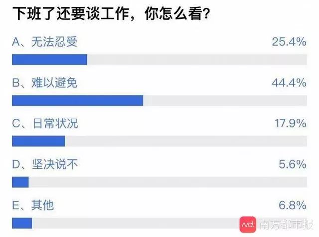 从调查结果来看,有四成网友对下班还要谈工作表示理解,认为这是难以避免的事情,四分之一网友无法忍受下班后还要谈工作,5.6%网友对其坚决说不。