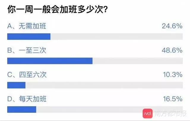调查结果显示,尽管有八成网友都需加班,但近五成网友每周的加班次数是1至3次,每周需要加4至6次班甚至是每天都得加班的只占10.3%和16.5%.从整体情况来看,需要高强度加班的还只是少部分。