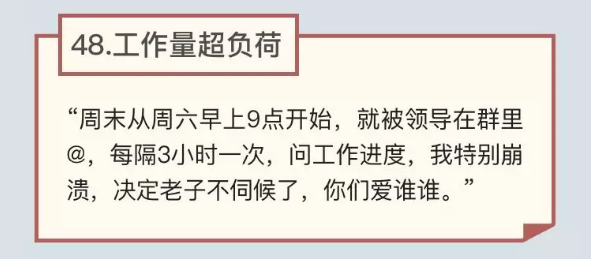 曾经有一份《95后辞职的69个理由》报告,69条辞职理由中有24条是与领导相关的,有9条是与加班相关的,或是活儿已干完正常下班,却总被领导在群里问:为什么走那么早?或是周末一早加班还时不时被老板逼问进度等等。
