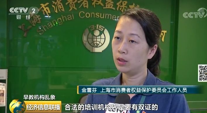 上海市消费者权益保护委员会工作人员 金雪芬:合法的培训机构是要有双证的,也就是营业执照和办学的许可证。不要为了贪图打折便宜,交付很长时间的学费,因为按照国务院出台的关于规范校外培训机构发展意见的规定,可以只要交付三个月以上,避免更大的损失。
