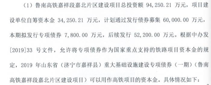 比如鲁南高铁嘉祥段嘉北片区建设项目总投资9.42亿,其中项目单位自筹资本金3.42亿,计划通过发行债券募集资金6亿(本期发行0.78亿,后续发行5.22亿),其中本期发行的专项债作为资本金。