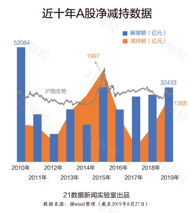 据21数据新闻实验室统计,自2007年起,A股已连续12年出现净减持,今年8月还未结束净减持额已逾千亿,全年很大概率上延续净减持。叠加今年是限售股解禁大年因素,今年A股减持总额有望创近十年新高。