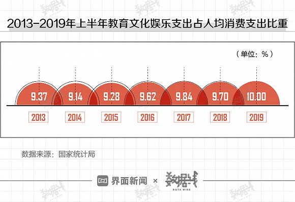 国家统计局数据显示,2019年上半年全国居民人均教育文化娱乐消费支出1033元,占人均消费支出的比重为10.0%,为近7年来新高。