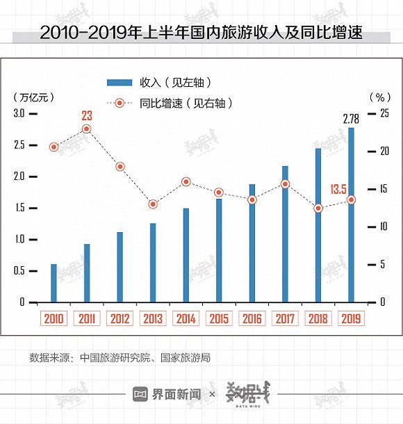 国内旅游人数增长放缓,但花钱的速度没落下。2019年上半年国内旅游收入2.78万亿元,同比增长13.5%,较去年同期上升1个百分点。