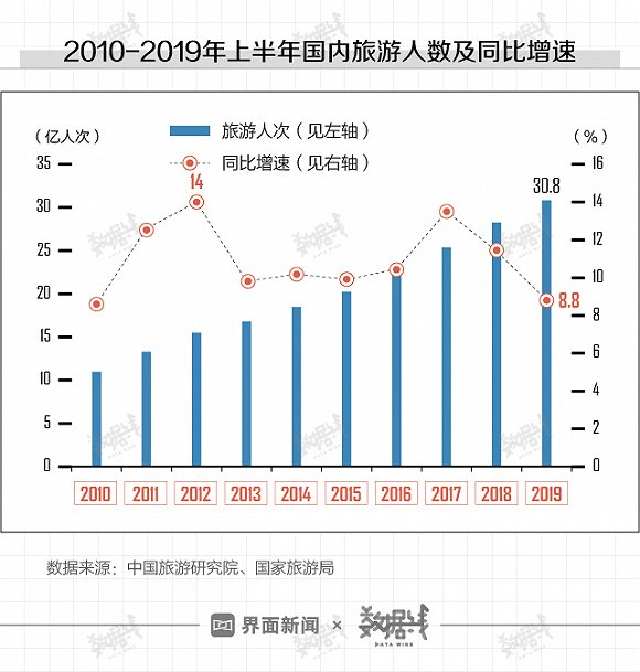 根据中国旅游研究院数据,2019年上半年预计国内旅游人数30.8亿人次,同比增长8.8%,同比增速创下近9年来新低。