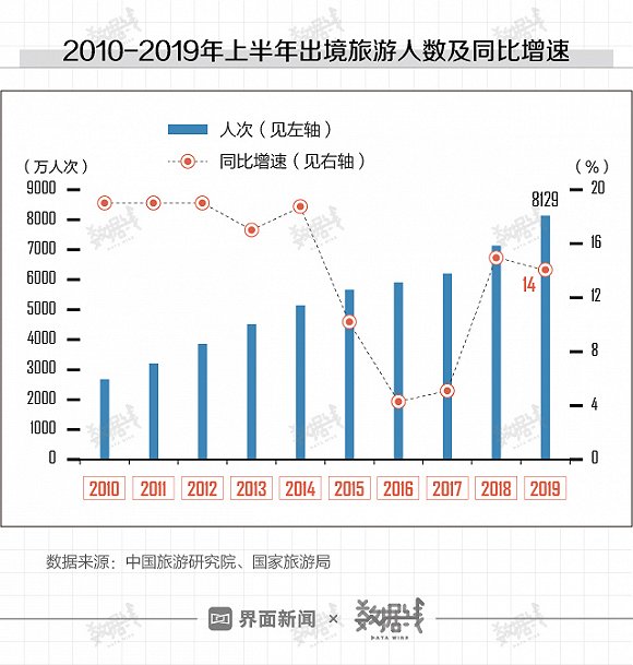 经历了2016和2017年的低迷,2019年上半年出境游人数依旧保持高速增长。中国旅游研究院数据显示,2019年上半年出境旅游人数约8129万人次,同比增长14%。