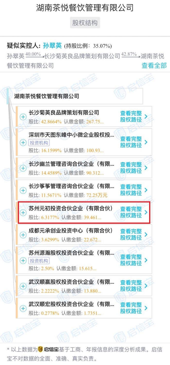 近期,阿里巴巴入股了网红茶饮茶颜悦色。据启信宝数据显示,7月5日,茶颜悦色的运营主体湖南茶悦餐饮管理有限公司发生工商变更,苏州元初投资合伙企业(有限合伙)成为新增股东,持股比例6.32%。