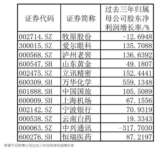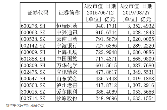 二是新成长起来、迈入千亿的公司。例如,恒瑞医药、中国国旅、上海机场、牧原股份、立讯精密、万华化学、泸州老窖、宁波银行、爱尔眼科、中兴通讯、云南白药、山东黄金等。