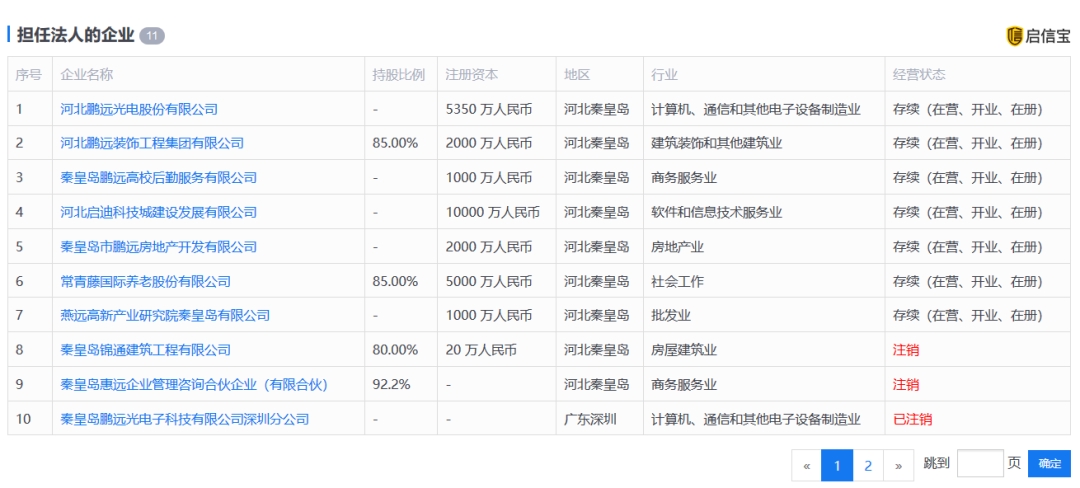 据启信宝显示,该天价公寓的运营方——秦皇岛鹏远高校后勤服务有限公司,成立于2003年,注册资本1000万元人民币。法定代表人为朱立秋。据悉,朱立秋拥有几个MBA/EMBA硕士学位,为现任河北省政协常委、秦皇岛市政协常委、河北鹏远企业集团董事长。除了鹏远高校后勤服务有限公司外,她还担任其他10家企业的法人代表。