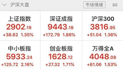 截至收盘,沪指涨1.35%收复2900点,深成指涨1.86%,创业板指涨1.71%,A股总市值一日增加逾8600亿元。